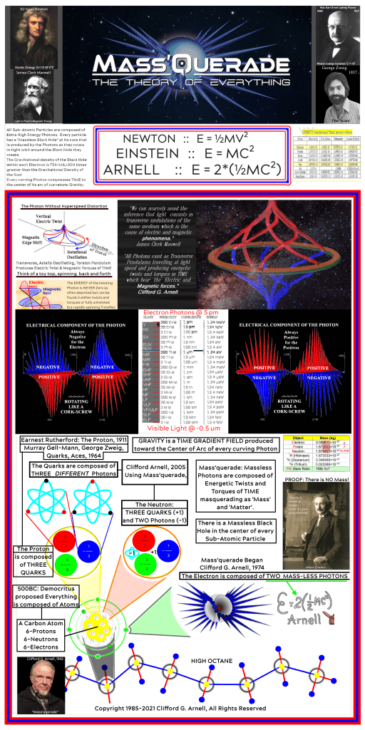 Arnell’s “Flash of Explanation” in now explained, at least at a superficial level. With this ‘proof’ in place that two bundles of kinetic energy might come together to form an Electron, the search for the explanation of a certain construct for the Photon that can show how Photons can be used to make Negatively charged Electrons and Positively charged Positrons, And, yes, even Neutrinos should begin. We must go down a very long, twisted, convoluted path that required dozens of breakthroughs that are all surprisingly supported by Physics experimentation and data to get deeper into the explanation of the so-called Leptons and eventually the Quarks and Hadrons. (While there may be nothing new under the Sun, we will find NEW EXPLANATIONS as seen in the new light of Mass’Querade.)
